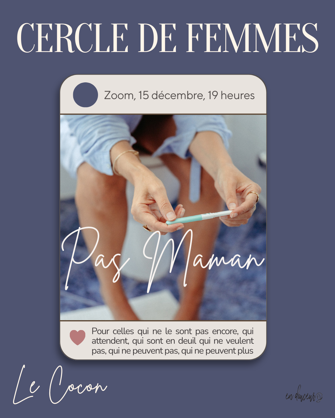 Lundi soir à 19 heures sur Zoom je vous propose un Cercle de Parole « Pas Maman », un espace pour échanger, poser des mots pour faire sens et pour être écoutée sans jugement, pour se sentir peut-être moins seule.